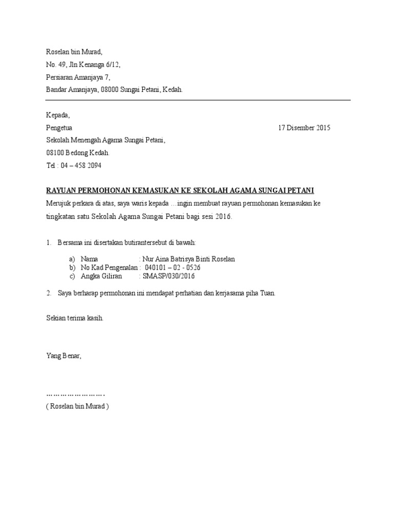 Contoh Surat Rayuan Permohonan Kemasukan Ke Sekolah Menengah Teknik Pdf